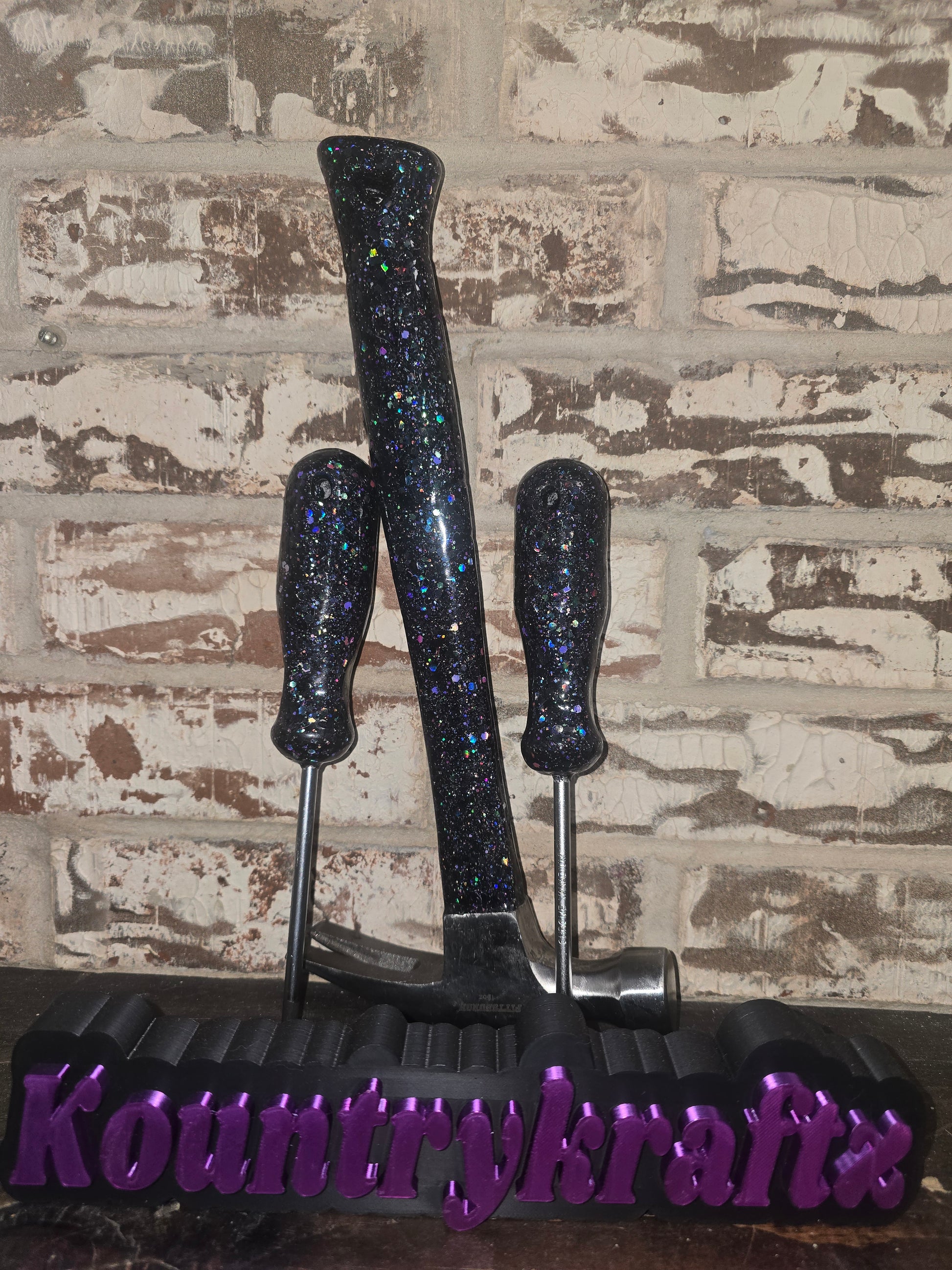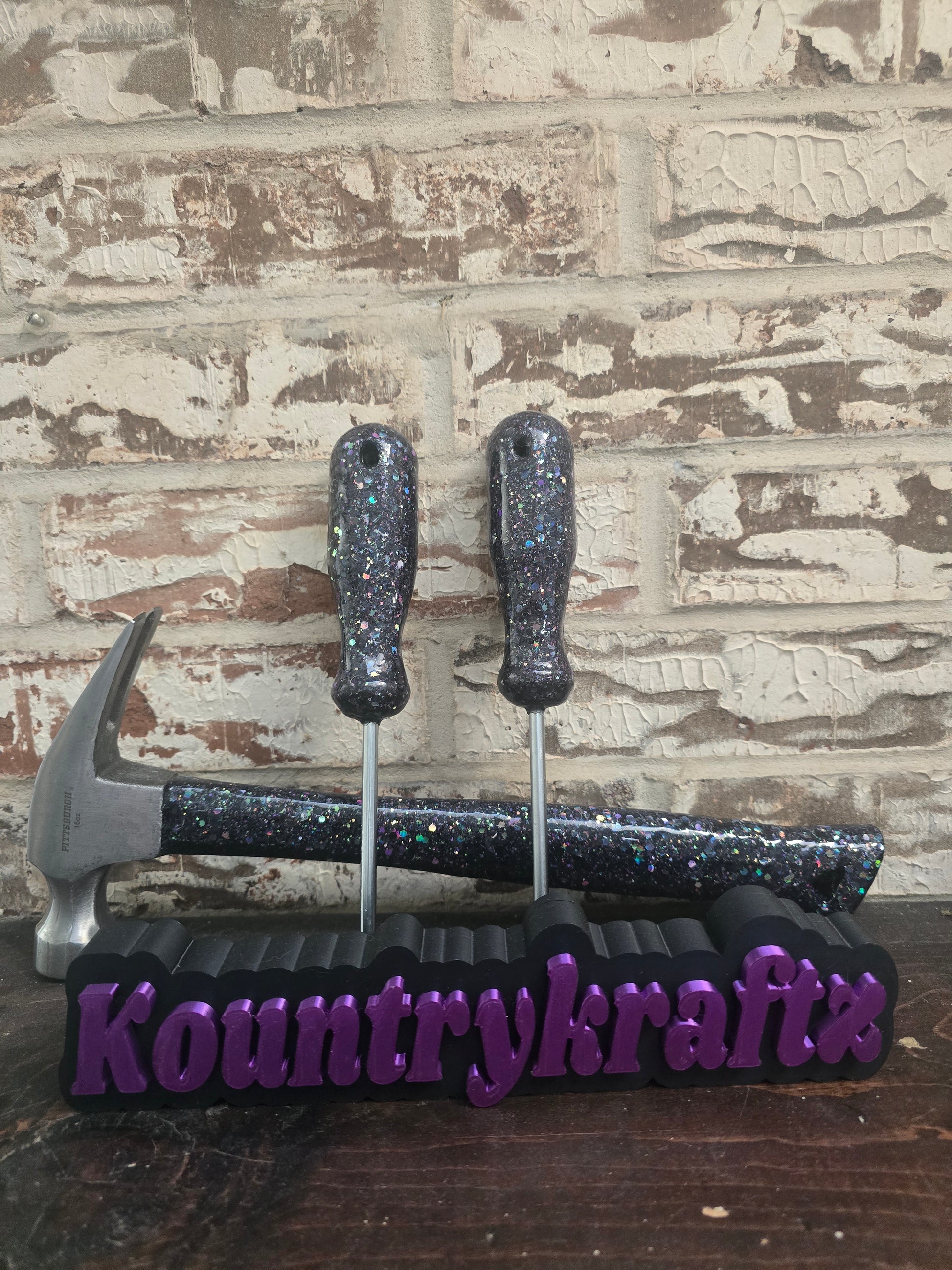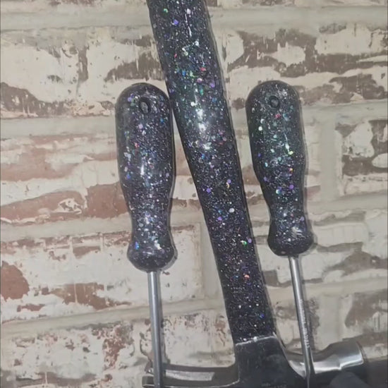 This one-of-a-kind black glitter hammer and screwdriver set is handmade to sparkle hard 💜✨